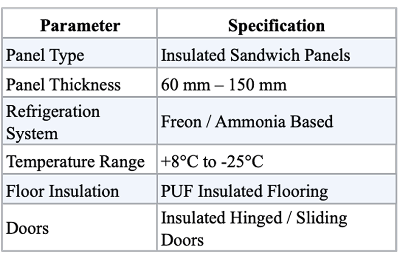 Each cold room is engineered according to storage capacity, temperature requirements, and product type.